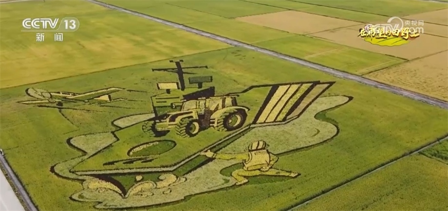總臺(tái)央視記者 蔣樹林:金秋9月的稻田是什么顏色的?9月的稻香又是什么味道?來(lái)這里,有可能會(huì)找到您想要的答案。我現(xiàn)在是在黑龍江北大荒閆家崗農(nóng)場(chǎng)。大家來(lái)看,這個(gè)稻田觀景臺(tái)有十多米高,因此站在這里,秋日稻田大片的圖案映入眼簾,今年稻田畫以“鄉(xiāng)村振興”“數(shù)字農(nóng)業(yè)”為主題,生動(dòng)展現(xiàn)了“讓農(nóng)業(yè)更美好、讓農(nóng)民更幸?!钡拿篮迷妇?。稻田畫是農(nóng)民們勤勞與智慧的展現(xiàn),他們用稻田畫為家鄉(xiāng)水稻代言,而對(duì)于在黑土地打拼的北大荒人而言,還有更重要的意義。