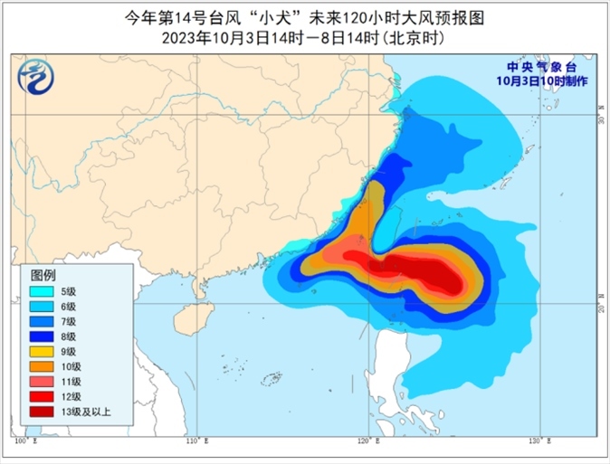 大風預報:3日下午至8日,臺灣以東洋面、巴士海峽、東海大部、臺灣海峽、南海東北部以及杭州灣、浙江沿海、福建沿海、廣東東南部沿海以及臺灣島沿海將有6~8級大風,其中,臺灣以東洋面、巴士海峽、臺灣海峽、南海東北部部分海面、福建沿海、廣東東南部沿海、臺灣島東南部和西部沿海的風力將有9~12級,“小犬”中心經過的附近海面風力可達13~16級,陣風17級。