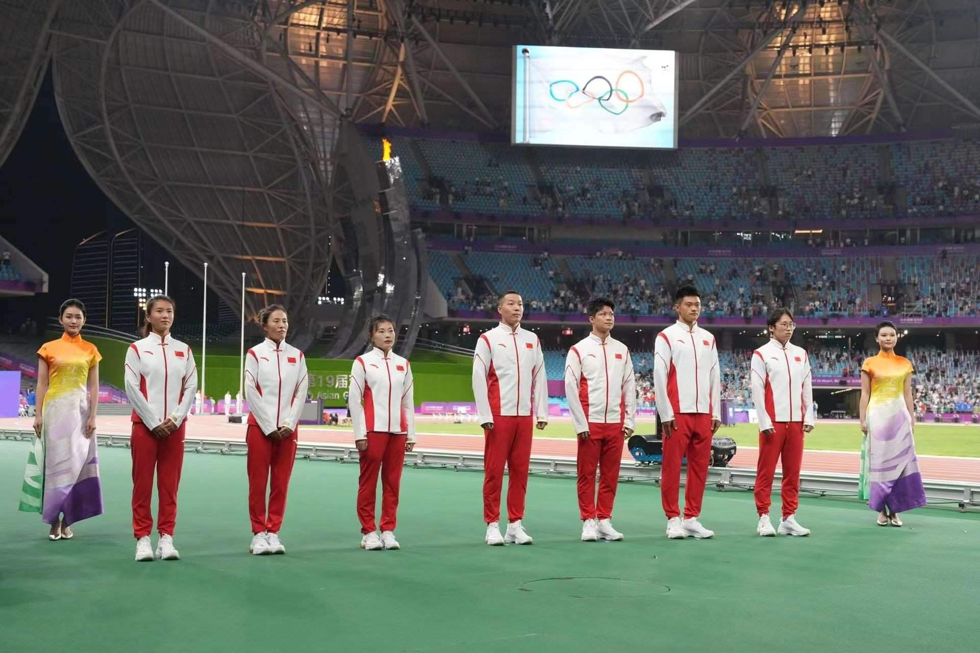 10月4日晚,在杭州亞運(yùn)會田徑比賽全部結(jié)束后,中國奧委會為蘇炳添、謝震業(yè)、吳智強(qiáng)、湯星強(qiáng)、切陽什姐、劉虹和呂秀芝補(bǔ)發(fā)了奧運(yùn)會獎(jiǎng)牌。
