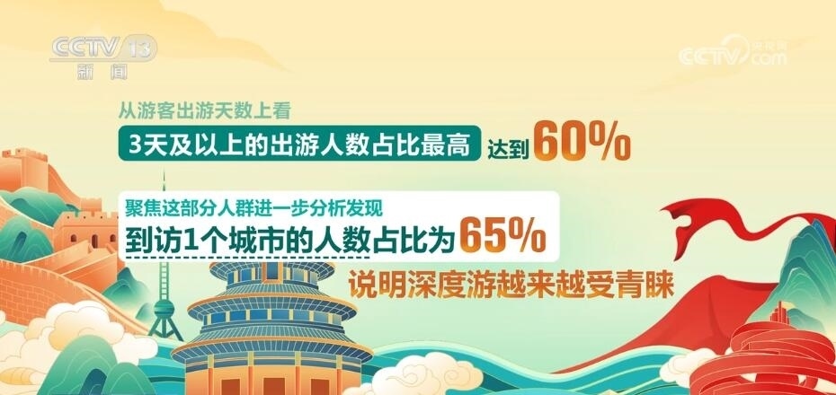 中國移動梧桐大數(shù)據(jù)借助通信服務、算力網(wǎng)絡,對全國用戶漫游、通信等數(shù)據(jù)進行統(tǒng)計分析后發(fā)現(xiàn),從9月29日至10月6日,各地旅游人數(shù)和相關消費均大幅上漲。其中,短途游熱度不減,中長途游持續(xù)升溫。200公里以內(nèi)的短途游占比達到38%;200—500公里的中等距離出游占比32%;500公里以上長途游占比為30%。從游客出游天數(shù)上看,3天及以上的出游人數(shù)占比最高,達到60%。聚焦這部分人群進一步分析發(fā)現(xiàn),到訪1個城市的人數(shù)占比為65%,說明深度游越來越受青睞。