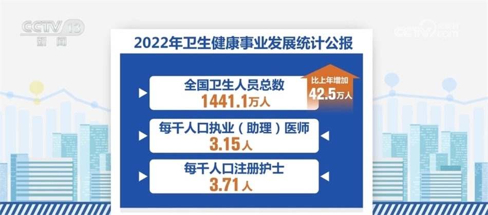 《公報》顯示,我國醫(yī)療衛(wèi)生資源總量繼續(xù)增加。到2022年末,全國醫(yī)療衛(wèi)生機構(gòu)達到1032918個,比上年增加1983個。全國共設(shè)置13個類別的國家醫(yī)學中心和兒童類別的國家區(qū)域醫(yī)療中心。全國醫(yī)療衛(wèi)生機構(gòu)床位975.0萬張,每千人口醫(yī)療衛(wèi)生機構(gòu)床位數(shù)由2021年的6.70張增加到2022年的6.92張。全國衛(wèi)生人員總數(shù)1441.1萬人,比上年增加42.5萬人。每千人口執(zhí)業(yè)(助理)醫(yī)師3.15人,每千人口注冊護士3.71人。