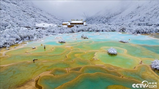 四川阿壩,黃龍景區(qū)迎來(lái)降雪,白雪與池水相映,宛如童話世界。