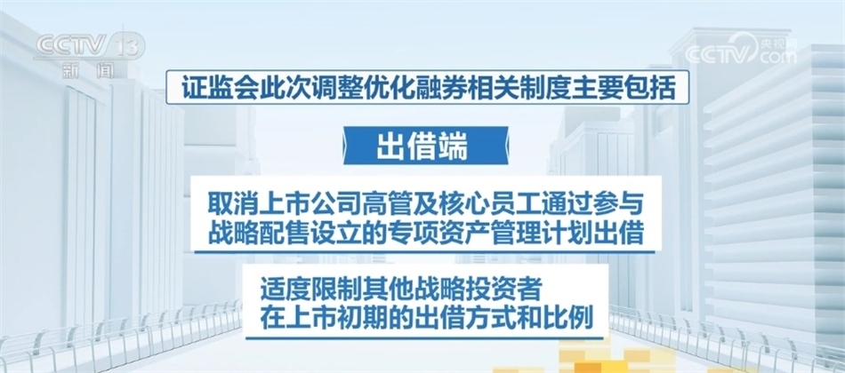 證監(jiān)會(huì)此次調(diào)整優(yōu)化融券相關(guān)制度主要包括:融券端,將融券保證金比例由不得低于50%上調(diào)至80%,對私募證券投資基金參與融券的保證金比例上調(diào)至100%;出借端,取消上市公司高管及核心員工通過參與戰(zhàn)略配售設(shè)立的專項(xiàng)資產(chǎn)管理計(jì)劃出借,適度限制其他戰(zhàn)略投資者在上市初期的出借方式和比例。