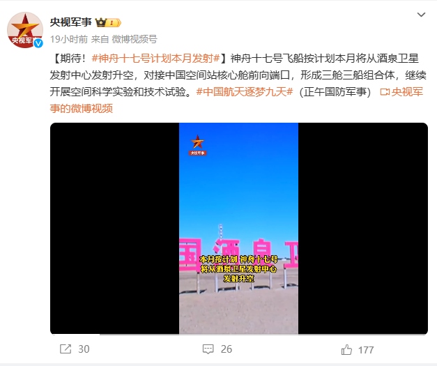 據(jù)“央視軍事”微博賬號(hào)報(bào)道 神舟十七號(hào)飛船按計(jì)劃本月(十月)將從酒泉衛(wèi)星發(fā)射中心發(fā)射升空,對(duì)接中國(guó)空間站核心艙前向端口,形成三艙三船組合體,繼續(xù)開展空間科學(xué)實(shí)驗(yàn)和技術(shù)試驗(yàn)。