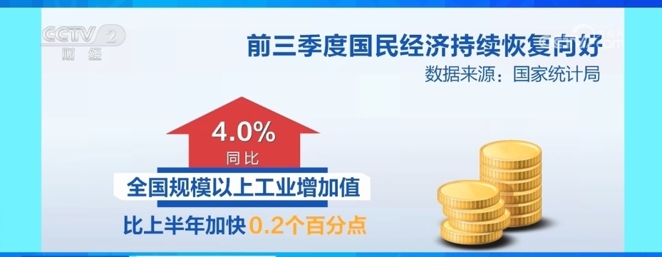 工業(yè)生產(chǎn)恢復(fù)加快,裝備制造業(yè)較快增長。前三季度,全國規(guī)模以上工業(yè)增加值同比增長4.0%,比上半年加快0.2個(gè)百分點(diǎn)。