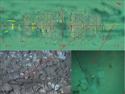 沉船遺址水深約30米,主體區(qū)域殘存有木質(zhì)船體和成摞擺放的船貨堆積,范圍約300平方米。考古發(fā)掘發(fā)現(xiàn),沉船船體殘長約16.95米,最寬處保存約4.5米,殘存9道隔艙板和10個船艙,單層板結(jié)構(gòu),發(fā)現(xiàn)桅座、龍骨板、龍骨補(bǔ)強(qiáng)材以及舭龍骨等船體構(gòu)件。