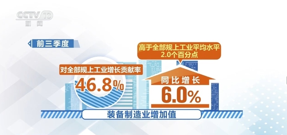 前三季度,在工業(yè)41個(gè)大類行業(yè)中,27個(gè)行業(yè)增加值實(shí)現(xiàn)增長,增長面達(dá)65.9%。其中,裝備制造業(yè)增加值同比增長6.0%,高于全部規(guī)上工業(yè)平均水平2.0個(gè)百分點(diǎn),對(duì)全部規(guī)上工業(yè)增長貢獻(xiàn)率達(dá)46.8%。