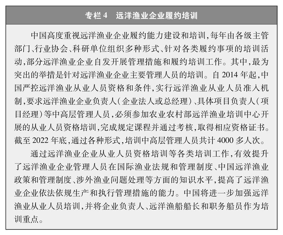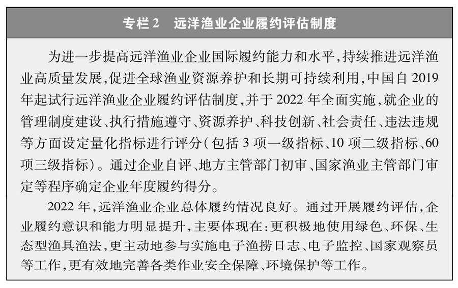 遠洋漁業(yè)企業(yè)和漁船是履行國際公約、合法合規(guī)從事漁業(yè)生產的主體。2022年中國正式實施遠洋漁業(yè)企業(yè)履約評估制度,將企業(yè)履約成績與行政審批、政策支持等掛鉤,通過正向激勵、反向倒逼的方式,引導企業(yè)不斷完善管理制度,嚴格執(zhí)行管理措施,避免發(fā)生違規(guī)行為,切實提高履約能力。這一制度有力促進了遠洋漁業(yè)企業(yè)規(guī)范管理和國際履約,得到了各方關注和廣泛認可。