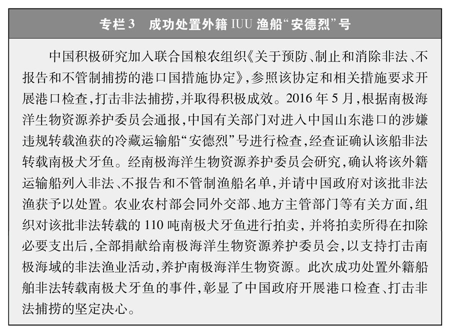 堅決支持并積極配合國際社會打擊各種非法漁業(yè)活動。2020年起,中國每年派遣執(zhí)法船赴北太平洋公海開展?jié)O業(yè)執(zhí)法巡航,查處違規(guī)作業(yè)行為。2016年,配合南極海洋生物資源養(yǎng)護委員會成功扣押處置了一艘外籍漁船非法轉載南極犬牙魚案件。2018年起,將中國加入的相關區(qū)域漁業(yè)管理組織公布的非法、不報告和不管制漁船名單通報國內各港口,拒絕此類漁船進港以及卸貨、補給、加油等活動。