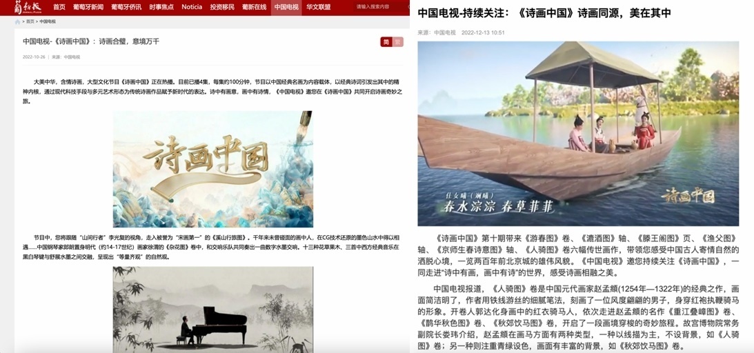 同時(shí),《詩畫中國(guó)》在傳播上也達(dá)到了節(jié)目?jī)?nèi)外的同頻共振,成功讓華夏文明輻射至全世界。在美國(guó)《國(guó)際日?qǐng)?bào)》網(wǎng)站和社交媒體賬號(hào)、法國(guó)《歐洲時(shí)報(bào)》網(wǎng)站和App、俄羅斯《龍報(bào)》網(wǎng)站和世界頭條App“北極熊視野”賬號(hào)等華文新媒體平臺(tái)上,節(jié)目相關(guān)內(nèi)容廣受歡迎。在2022“非洲伙伴”媒體合作論壇上,《詩畫中國(guó)》還作為總臺(tái)優(yōu)秀作品進(jìn)行了展示。日前于戛納影節(jié)宮舉辦的第六屆WISDOM in CHINA中國(guó)原創(chuàng)節(jié)目模式推介會(huì)上,節(jié)目更是以中國(guó)原創(chuàng)之名,登上了Mipcom主舞臺(tái)。