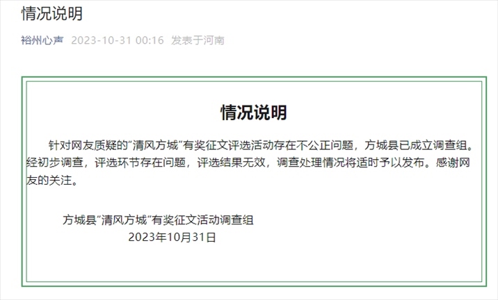 ·獲獎(jiǎng)?wù)魑?2篇為同一作者,官方通報(bào)調(diào)查結(jié)果:評(píng)選環(huán)節(jié)存在問(wèn)題,評(píng)選結(jié)果無(wú)效。