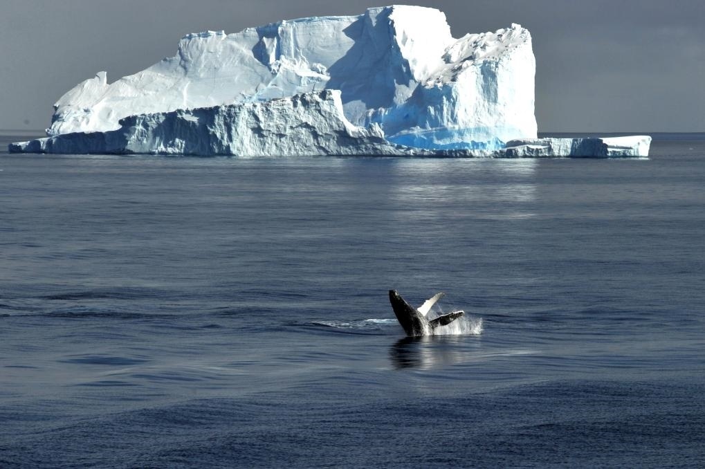 一只鯨魚(yú)在羅斯海的一座冰山腳下露出海面。新華社記者 張建松 攝