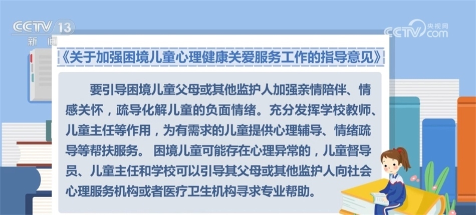 要引導困境兒童父母或其他監(jiān)護人加強親情陪伴、情感關懷,疏導化解兒童的負面情緒。充分發(fā)揮學校教師、兒童主任等作用,為有需求的兒童提供心理輔導、情緒疏導等幫扶服務;困境兒童可能存在心理異常的,兒童督導員、兒童主任和學??梢砸龑涓改富蚱渌O(jiān)護人向社會心理服務機構或者醫(yī)療衛(wèi)生機構尋求專業(yè)幫助。