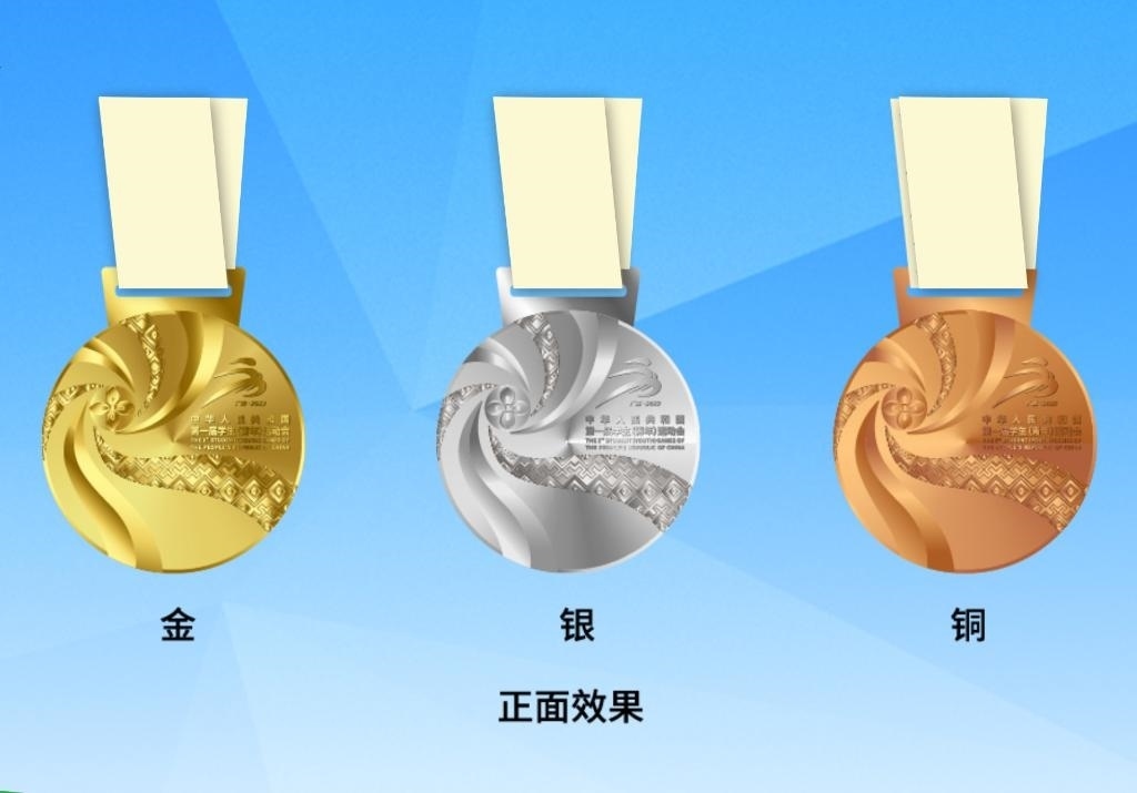 首屆學(xué)青會(huì)獎(jiǎng)牌正面采用繡球、壯錦等廣西元素,以繡球?yàn)樵O(shè)計(jì)焦點(diǎn),通過(guò)壯錦飄帶向外綻放,如一朵盛開(kāi)的鮮花,表達(dá)歡迎四方友人共赴學(xué)青盛會(huì)的美意;獎(jiǎng)牌背面以廣西銅鼓鼓面為原型,中心太陽(yáng)紋象征著年輕人的活力和熱情,四方配以圖騰鳥(niǎo),有著吉祥的寓意;外圈環(huán)繞了學(xué)青會(huì)的英文名稱和銅鼓經(jīng)典紋飾云雷紋。獎(jiǎng)牌整體寓意“團(tuán)結(jié)、活力、綻放”。