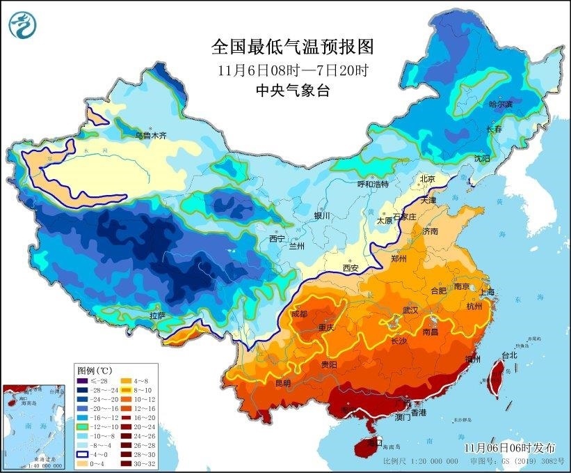 寒潮藍色預警:受強冷空氣影響,預計,11月6日08時至11月7日20時,內(nèi)蒙古東部、東北地區(qū)中南部、黃淮東部、江淮東部和南部、江南東部等地大部將先后降溫6~8℃,其中,內(nèi)蒙古東南部、東北地區(qū)中南部等地部分地區(qū)降溫可達10~14℃。最低氣溫0℃線將位于河北北部、天津北部、山西南部至陜西關(guān)中平原、甘肅東南部一帶,長江中下游以北地區(qū)有4~6級偏北風,陣風7~9級,局地可達10級;6日至7日夜間,渤海、黃海、東海等海域有7~8級風,最大陣風9~11級。