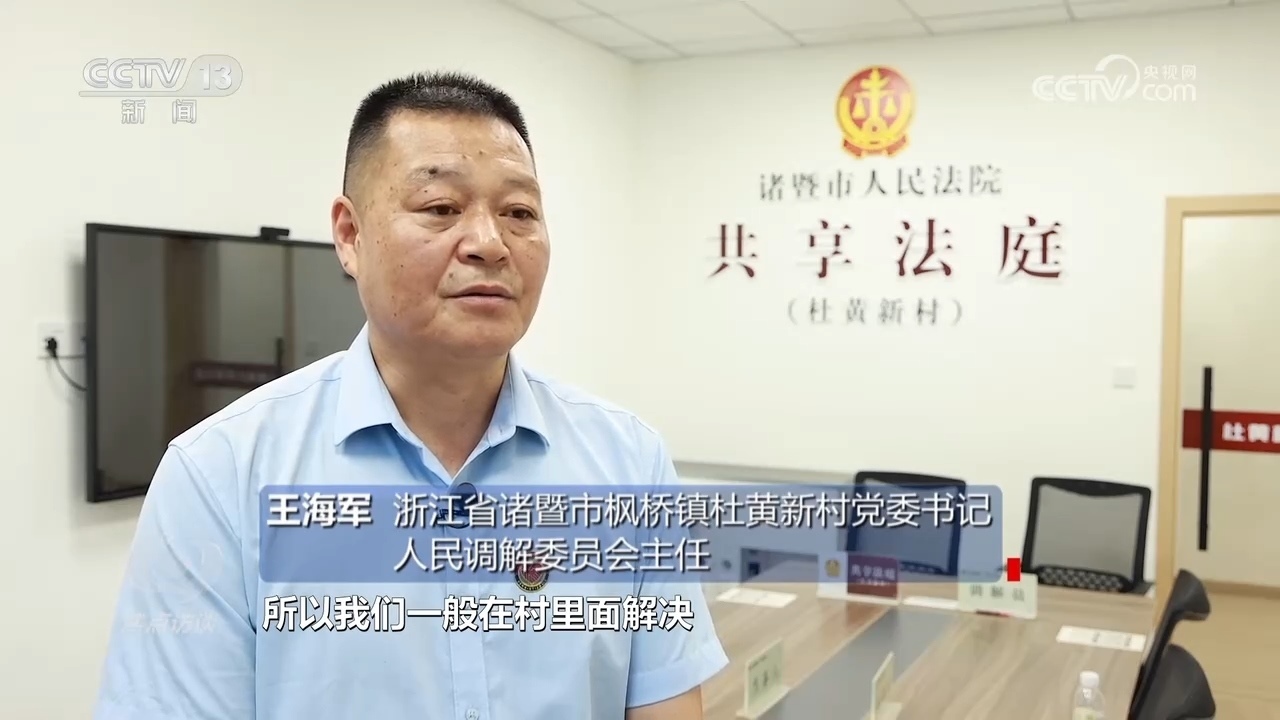 浙江省諸暨市楓橋鎮(zhèn)杜黃新村黨委書記、人民調(diào)解委員會(huì)主任王海軍:“村里一般的調(diào)解村兩委會(huì)以及村調(diào)委基本上就地解決,因?yàn)椤畻鳂蚪?jīng)驗(yàn)’矛盾不出村,所以我們一般在村里面解決。但是涉及到法律法規(guī)一塊或者有些老百姓在‘心結(jié)’上面解不開,我們就動(dòng)用共享法庭?!?/p>