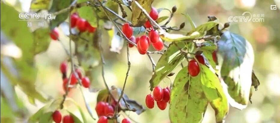 山林間,成片的山茱萸樹在褪去枯葉后,紅彤彤的果實(shí)便顯露出來,密密麻麻綴滿枝頭。種植戶們穿梭林間,忙著采摘。