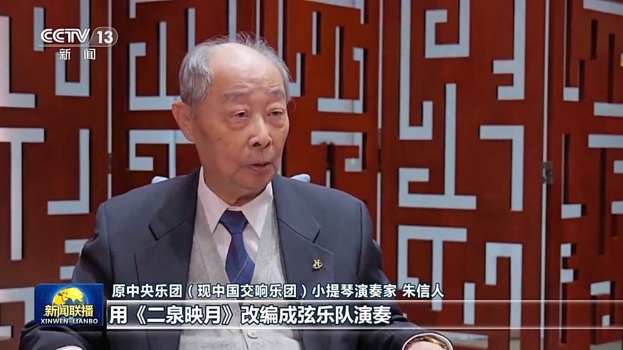 原中央樂團(現(xiàn)中國交響樂團)小提琴演奏家 朱信人:1973年我們是用《二泉映月》改編成弦樂隊演奏,他們聽了以后非常喜歡這首作品,當(dāng)場就要總譜,他們準備演。他們也看了我們的樂器,有的當(dāng)場就把自己的小號送給我們了。音樂大家都是融合的。