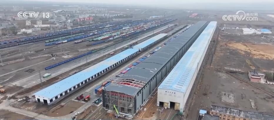 總臺(tái)記者 崔寧:在我的身后有一小一大、一舊一新兩座換裝庫(kù),它們主要是對(duì)入境的中歐班列進(jìn)行換裝。小的這座看起來(lái)也比較舊,它建于2008年,到目前為止已經(jīng)投用了整整15年。隨著“一帶一路”倡議的不斷推進(jìn),現(xiàn)在經(jīng)阿拉山口口岸出入境的中歐班列數(shù)量已經(jīng)由最初月均3.5列增加到日均17列。所以,它的存在也已經(jīng)遠(yuǎn)遠(yuǎn)不能滿足現(xiàn)在發(fā)展的需求,也正因?yàn)槿绱?,在它的旁邊又新建了一座大的換裝庫(kù),它建成投用之后將取而代之成為目前亞洲最大的室內(nèi)集裝箱換裝庫(kù)。