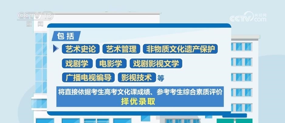 據(jù)了解,藝術(shù)類專業(yè)依據(jù)考生高考文化成績、專業(yè)考試成績,參考綜合素質(zhì)評(píng)價(jià)進(jìn)行招生錄取。此次藝考改革一個(gè)重要的變化是,部分藝術(shù)類專業(yè)不再組織專業(yè)考試,包括藝術(shù)史論、藝術(shù)管理、非物質(zhì)文化遺產(chǎn)保護(hù)、戲劇學(xué)、電影學(xué)、戲劇影視文學(xué)、廣播電視編導(dǎo)、影視技術(shù)等,將直接依據(jù)考生高考文化課成績、參考考生綜合素質(zhì)評(píng)價(jià),擇優(yōu)錄取。