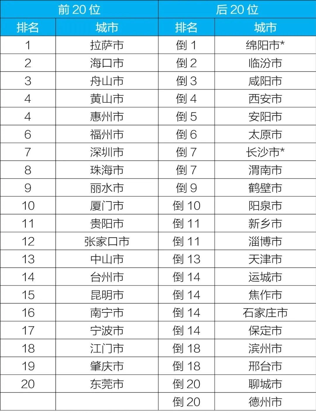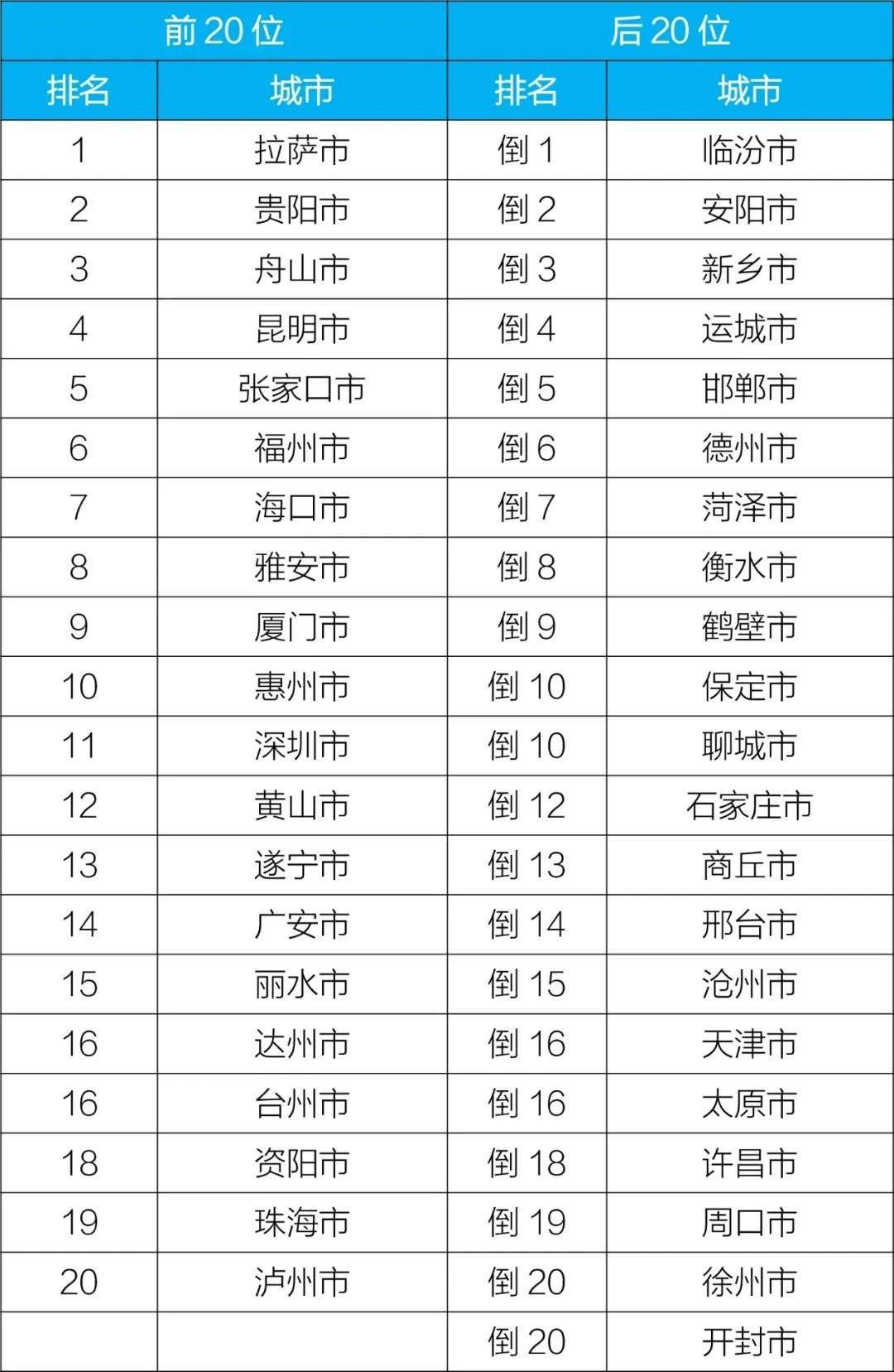 前20位和后20位城市名單