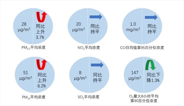 1—10月,全國(guó)339個(gè)地級(jí)及以上城市平均空氣質(zhì)量?jī)?yōu)良天數(shù)比例為85.1%,同比下降1.2個(gè)百分點(diǎn),較2019年同期上升2.9個(gè)百分點(diǎn);平均重度及以上污染天數(shù)比例為1.6%,同比上升0.8個(gè)百分點(diǎn),較2019年同期下降0.1個(gè)百分點(diǎn);PM2.5平均濃度為28微克/立方米,同比上升3.7%,較2019年同期下降17.6%;O3平均濃度為147微克/立方米,同比下降1.3%,較2019年同期下降2.6%;PM10平均濃度為51微克/立方米,同比上升6.2%;SO2平均濃度為8微克/立方米,同比持平;NO2平均濃度為20微克/立方米,同比持平;CO平均濃度為1.0毫克/立方米,同比持平。
