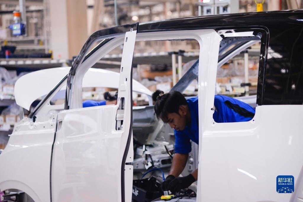 2月24日,在印度尼西亞勿加泗,工人在上汽通用五菱印尼汽車(chē)有限公司工廠的生產(chǎn)線上作業(yè)。新華社記者 徐欽 攝