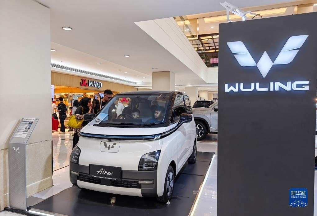10月1日,在印度尼西亞雅加達(dá)一家商場(chǎng),人們?cè)隗w驗(yàn)一輛五菱新能源車(chē)Air ev(手機(jī)照片)。新華社記者 徐欽 攝