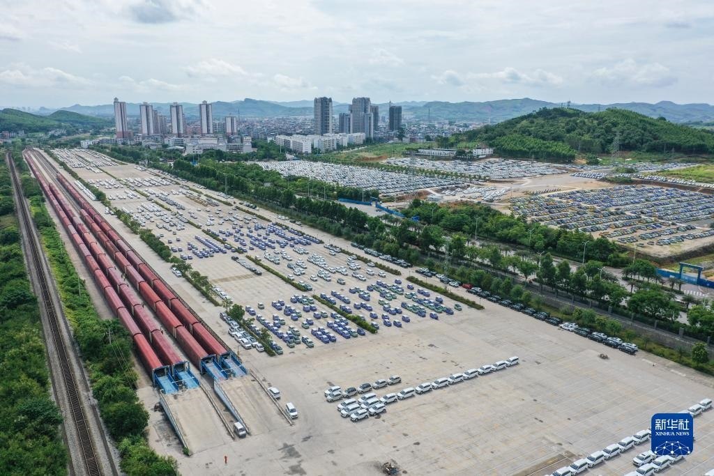 這是位于廣西柳州市的雒容汽車(chē)物流基地,一些出口的新能源汽車(chē)從這里裝車(chē)運(yùn)往各大出海港口(7月19日攝,無(wú)人機(jī)照片)。新華社記者 曹祎銘 攝