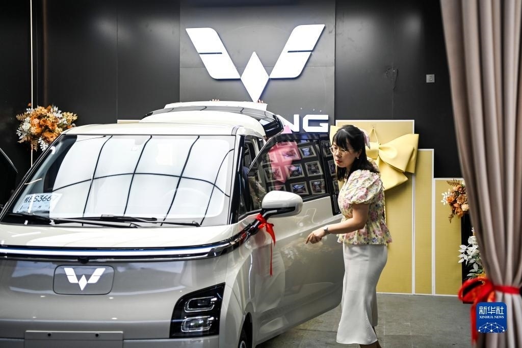 在廣西柳州市一家新能源汽車(chē)銷(xiāo)售店內(nèi),一位車(chē)主提驗(yàn)新車(chē)(7月20日攝)。新華社記者 曹祎銘 攝