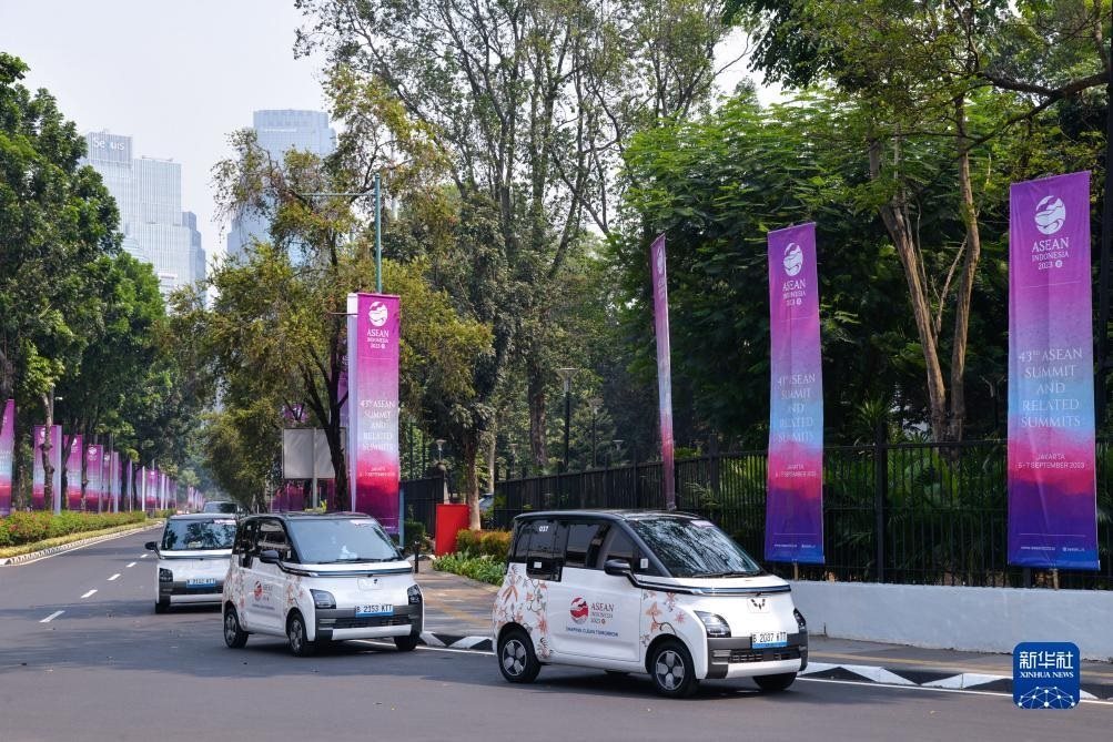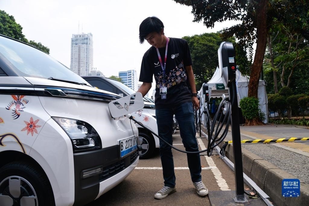9月6日,在印度尼西亞雅加達(dá)第43屆東盟峰會(huì)五菱汽車(chē)服務(wù)站,工作人員為一輛五菱新能源車(chē)Air ev充電。新華社記者 徐欽 攝
