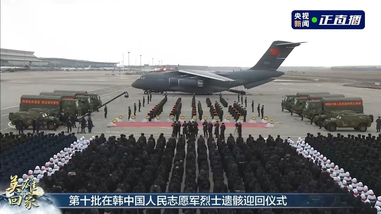 北京時(shí)間上午9時(shí),中韓雙方在韓國(guó)仁川國(guó)際機(jī)場(chǎng)舉行志愿軍烈士遺骸交接儀式。上午11時(shí)32分,空軍專機(jī)運(yùn)-20緩緩降落在遼寧沈陽(yáng)桃仙國(guó)際機(jī)場(chǎng)。專機(jī)進(jìn)入中國(guó)領(lǐng)空后,空軍兩架殲-20戰(zhàn)斗機(jī)護(hù)航,并在沈陽(yáng)機(jī)場(chǎng)上空拉煙通場(chǎng),“雙20同框”向志愿軍烈士致以崇高敬意,沈陽(yáng)桃仙機(jī)場(chǎng)以“過水門”航空最高禮儀迎接志愿軍烈士回家。