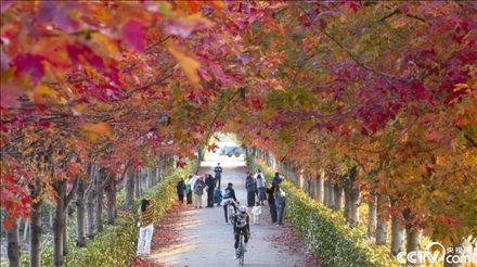 2023年11月24日,蘇州工業(yè)園區(qū)陽澄湖半島莆田有機(jī)農(nóng)業(yè)園紅楓大道上的紅葉燦爛如霞,已到最佳觀賞期,吸引游客前來賞楓。