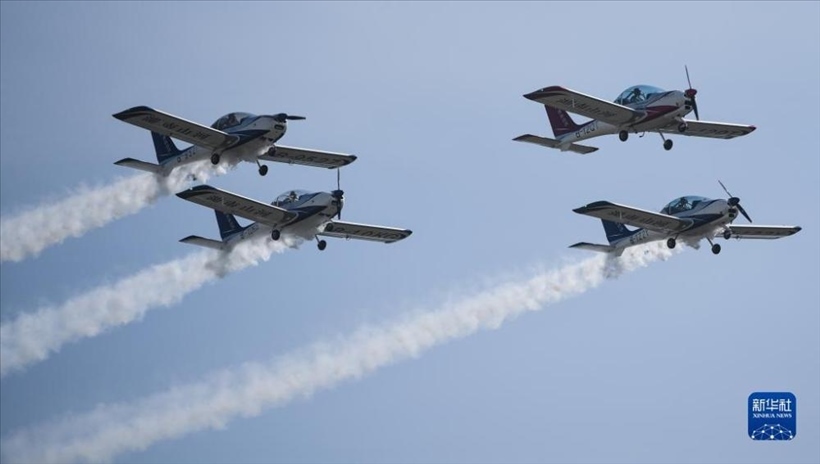 11月23日,山河飛行表演隊在2023亞洲通用航空展開幕式上進(jìn)行飛行表演。