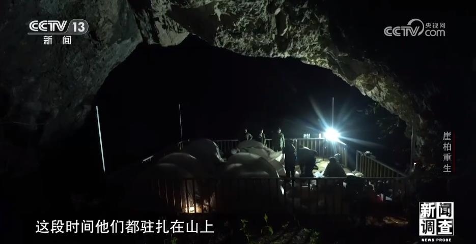 調(diào)查用的工具、保險繩、干糧、帳篷,僅僅是這些必需品,他們的背包就有好幾十斤重。無人區(qū)里沒有路,沿途基本都是密集的樹林和雜草,隊員們只能用砍刀開路。有些崖壁是直接懸空的,根本沒有著力點(diǎn)。隊員們就從山林里找來廢棄的木頭,用鐵絲捆在一起,搭成木橋和圍欄。走了四個多小時,他們終于在一處懸崖發(fā)現(xiàn)了野生崖柏。他們手中的儀器叫做定位器,可以精確記錄崖柏生長地點(diǎn)的經(jīng)緯度和海拔,給科研提供更精確的信息。