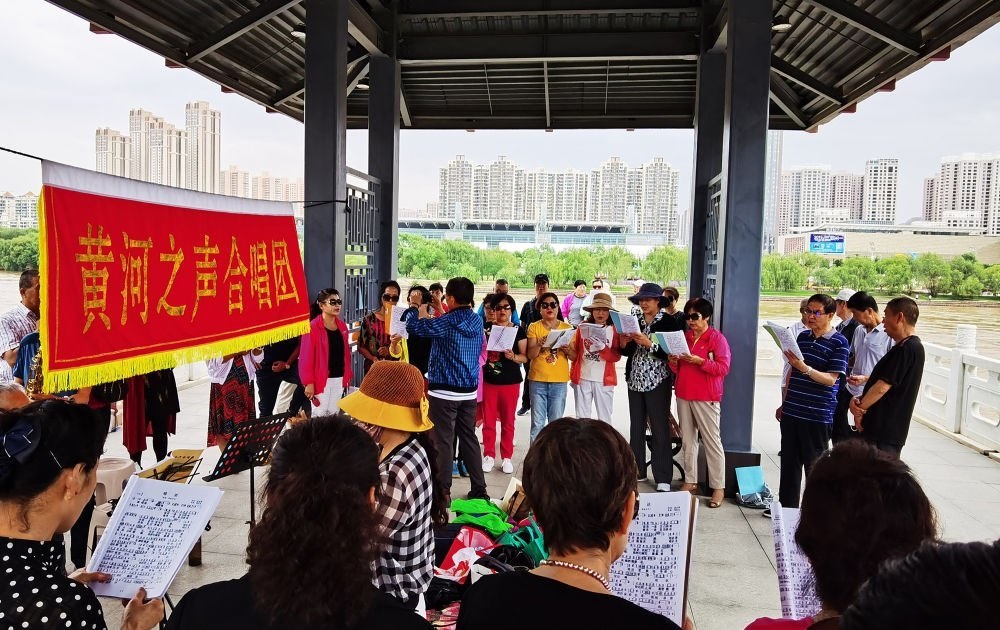 在蘭州市城關(guān)區(qū)黃河治理蘭鐵泵站項(xiàng)目點(diǎn),黃河之聲合唱團(tuán)開展合唱活動(2020年6月15日攝)。