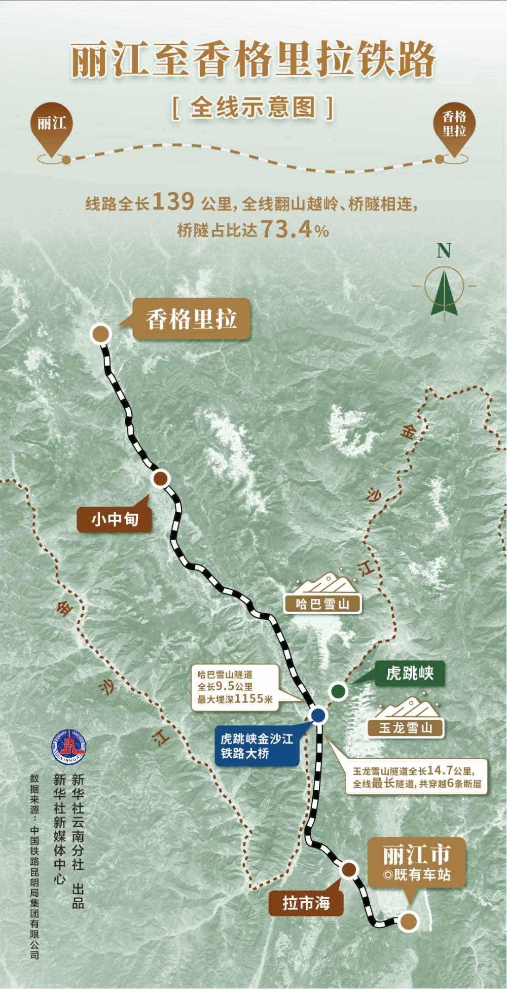 2023年11月26日,麗江至香格里拉鐵路正式開通運(yùn)營,鐵路全長139公里,設(shè)計(jì)時(shí)速140公里,為國家I級(jí)單線電氣化鐵路,兩地間最快1小時(shí)18分可達(dá)。