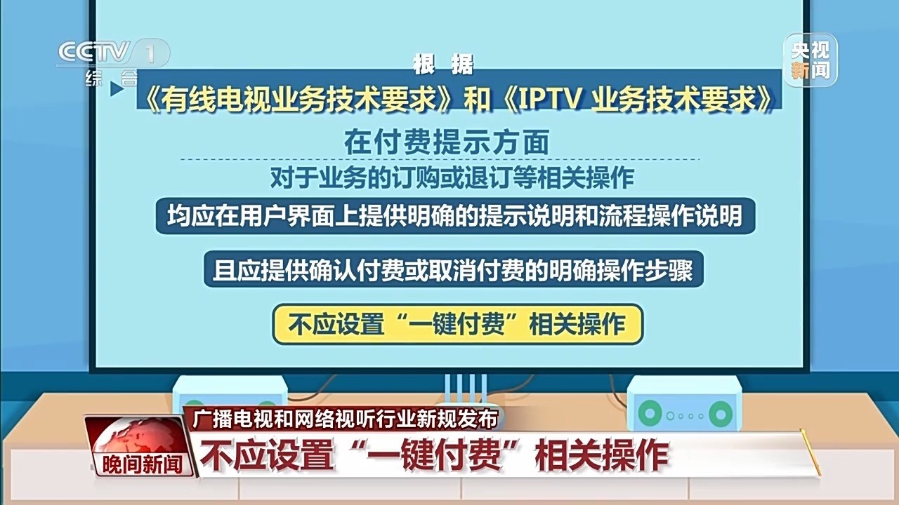 在付費(fèi)提示方面,對(duì)于業(yè)務(wù)的訂購(gòu)或退訂等相關(guān)操作,均應(yīng)在用戶界面上,提供明確的提示說(shuō)明和流程操作說(shuō)明,且應(yīng)提供確認(rèn)付費(fèi)或取消付費(fèi)的明確操作步驟,不應(yīng)設(shè)置“一鍵付費(fèi)”相關(guān)操作。此外,有線電視和IPTV遙控器應(yīng)具備快捷看直播頻道的按鍵,通過(guò)此按鍵直接進(jìn)入全屏直播,按鍵名稱(chēng)應(yīng)為“看電視”。
