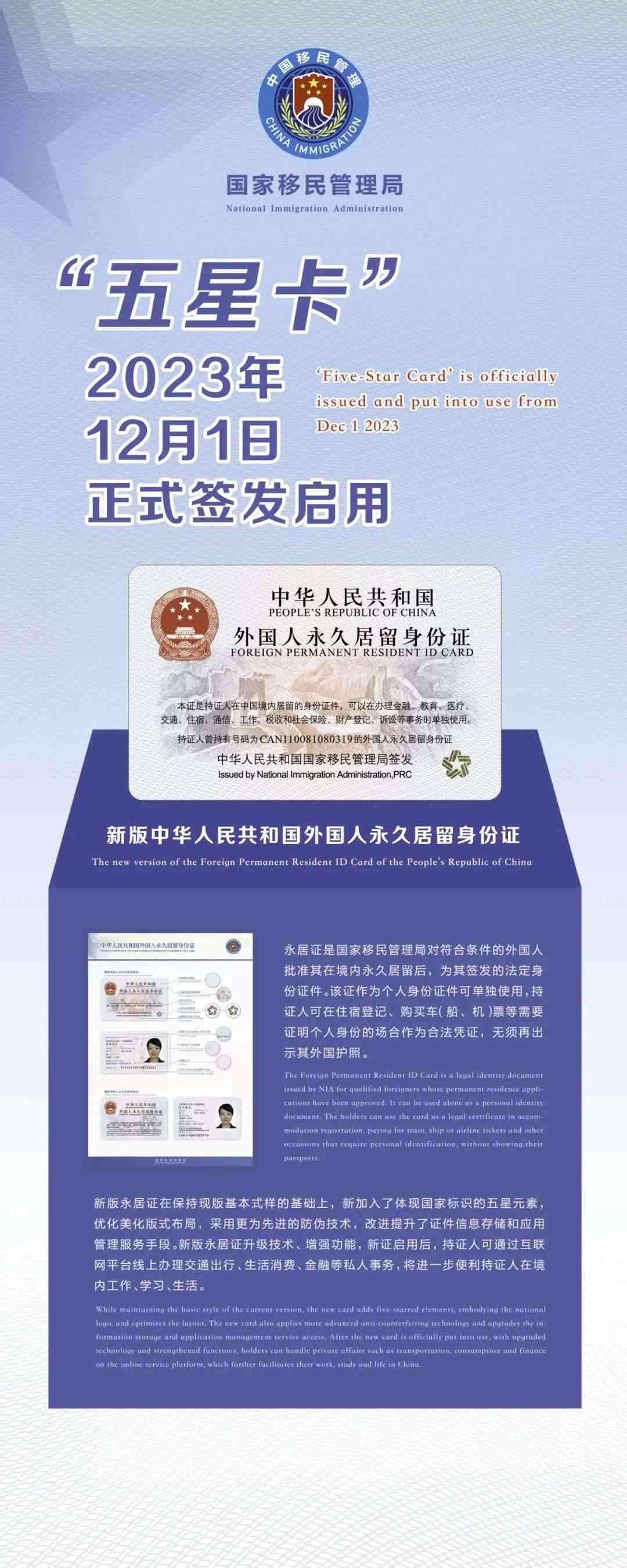 國家移民管理局相關負責人介紹,“五星卡”由國家移民管理局簽發(fā),是經批準在中國境內永久居留外國人的法定身份證件。持證人可在需要證明個人身份的場合作為個人身份憑證單獨使用,無須再出示其外國護照?!拔逍强ā眱?yōu)化了證件信息存儲方式,美化了版式布局,采用了更為先進的防偽技術,增強了個人信息保護和數(shù)據(jù)安全性。國家移民管理局會同有關部門大力推進各相關行業(yè)領域應用系統(tǒng)、設施設備的適配性升級改造,便于持證人在交通出行、生活消費、金融通信等公共服務、政務服務領域和互聯(lián)網平臺使用。