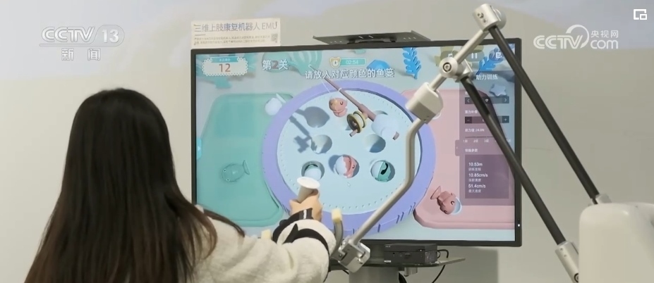 總臺記者 竇筠韻:幫助病人進行康復的機器人,可以根據(jù)病人手部力量的多少進行輔助推力,機器界面上還有各種有趣的游戲,使得康復訓練不無聊。