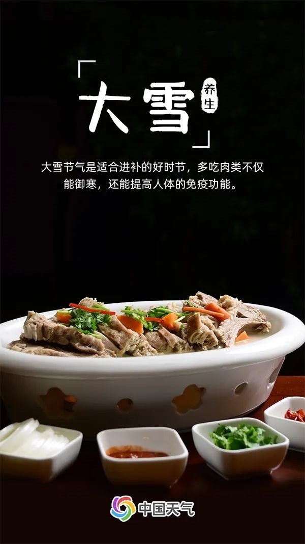 大雪也是適合進補的好時節(jié)。冬天的寒冷為放肆吃肉提供了充足的理由,肉類不僅能為我們的身體提供足夠的熱量以抵御嚴寒,還能提高人體的免疫功能,促進新陳代謝。不過,進補也要有“度”,除了吃肉,也要適當吃一些新鮮的水果和蔬菜,做到營養(yǎng)均衡。