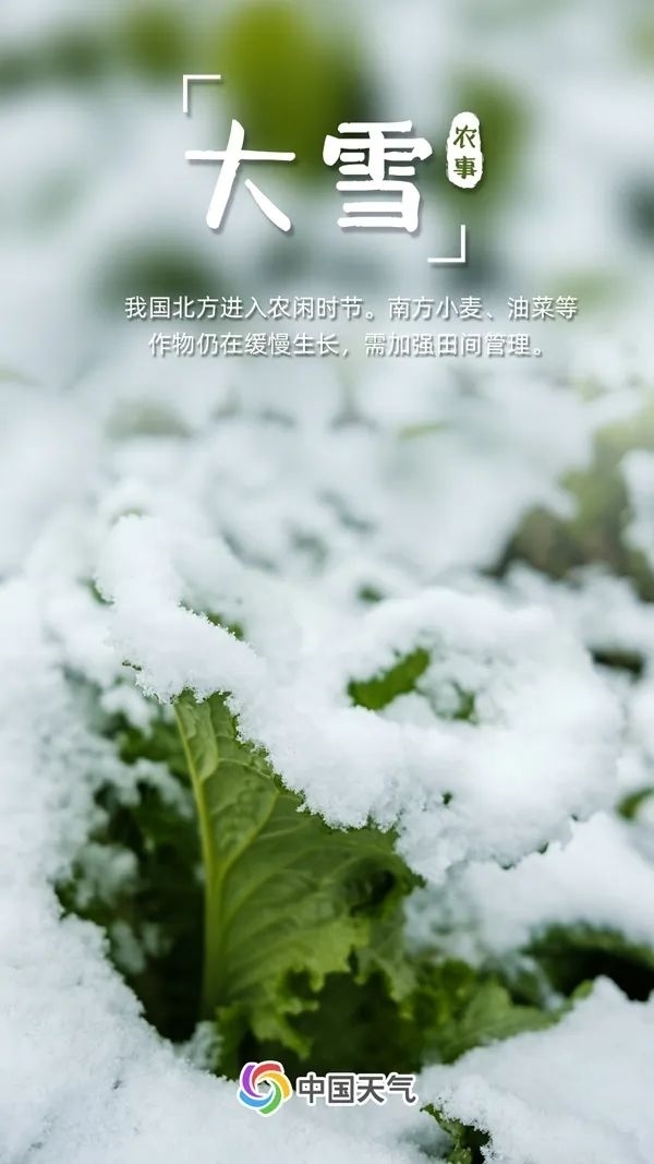 大雪時節(jié),我國北方地區(qū)冰天雪地,進入農(nóng)閑時節(jié)。而南方小麥、油菜等作物仍在緩慢生長,需要加強田間管理。一旦遭受凍害,要及時松土增肥、蓄水提溫、加強中后期管理,力爭把凍害損失降到最低。