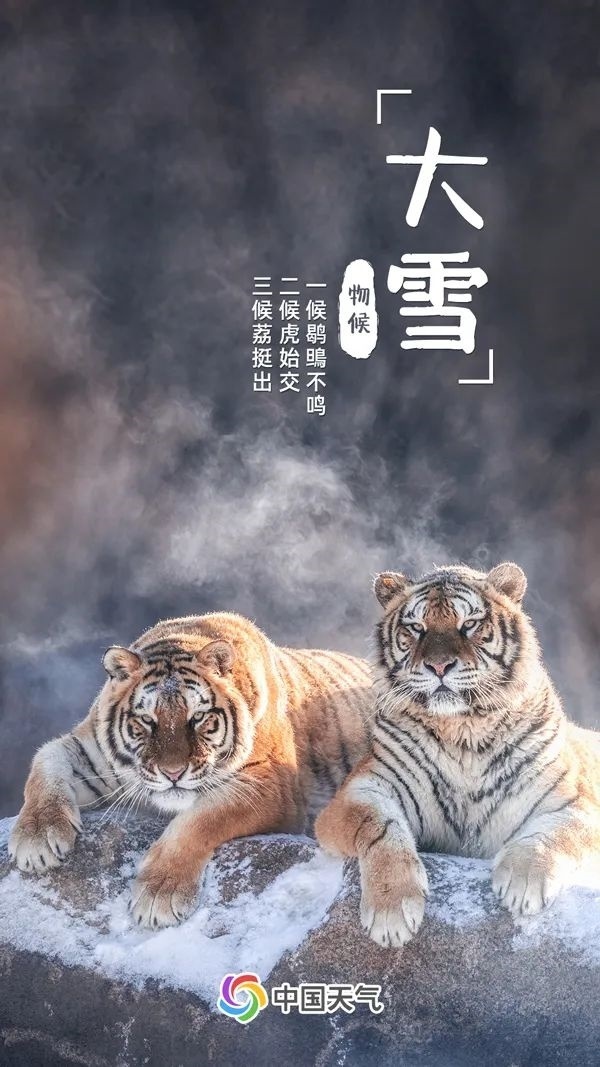 大雪分為三候:一候鹖鴠不鳴,因天氣寒冷,寒號鳥都不再鳴叫了;二候虎始交,由于此時是陰氣最盛的時期,且陽氣已有所萌動,老虎開始有求偶行為;三候荔挺出,“荔挺”是蘭草的一種,它們會在感到陽氣時抽出新芽。