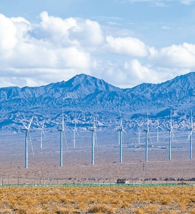甘肅酒泉玉門市,廣袤戈壁上的風(fēng)機。