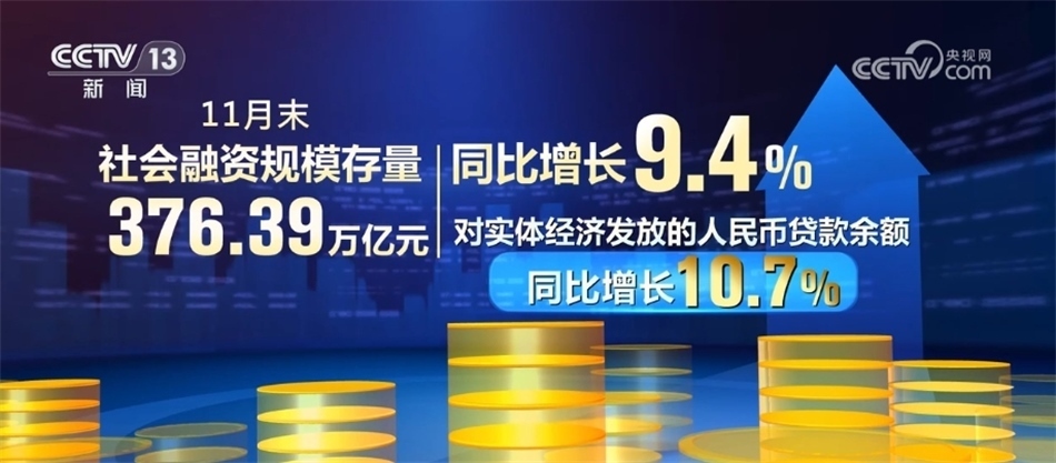 11月末社會(huì)融資規(guī)模存量為376.39萬億元,同比增長9.4%。其中,對(duì)實(shí)體經(jīng)濟(jì)發(fā)放的人民幣貸款余額同比增長10.7%。11月份社會(huì)融資規(guī)模增量為2.45萬億元,比上年同期多4556億元。