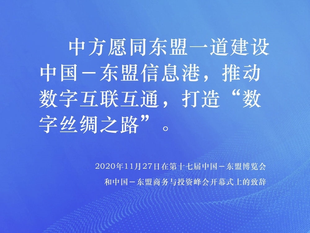 2014年,中國提出與東盟十國共建“中國-東盟信息港”倡議,得到了東盟各國的積極響應(yīng)。在第十七屆中國-東盟博覽會和中國-東盟商務(wù)與投資峰會開幕式上,習(xí)近平總書記提出“提升科技創(chuàng)新,深化數(shù)字經(jīng)濟合作”的重要倡議,表示中方愿同東盟各國攜手合作,抓住新一輪科技革命和產(chǎn)業(yè)變革機遇,發(fā)揮互補優(yōu)勢,聚焦合作共贏。