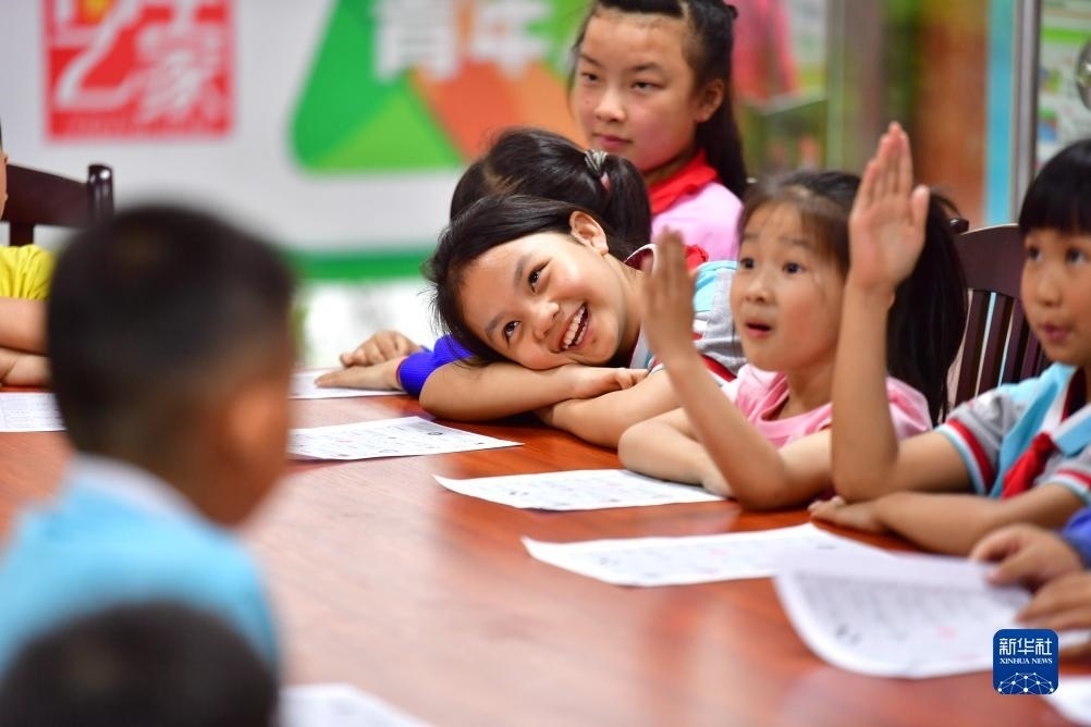 在廣西柳州市融水苗族自治縣易地扶貧搬遷安置小區(qū)苗家小鎮(zhèn)青年之家“六點(diǎn)小課堂”,孩子們參與興趣活動(dòng)(2022年5月5日攝)。近年來(lái),廣西柳州市融水苗族自治縣團(tuán)縣委在易地扶貧搬遷安置小區(qū)苗家小鎮(zhèn)、苗美社區(qū)開(kāi)設(shè)青年之家“六點(diǎn)小課堂”,定期組織青年志愿者,為這里的青少年開(kāi)展功課輔導(dǎo)、自護(hù)教育、科技小課堂等活動(dòng)。新華社記者 黃孝邦 攝