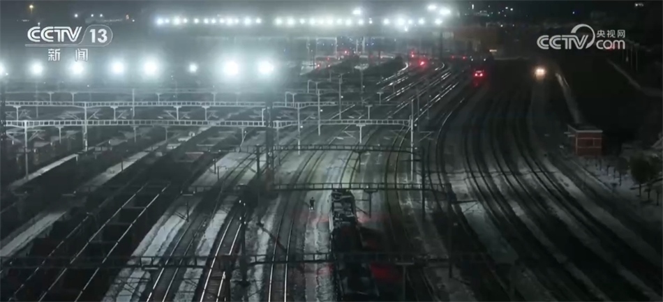 總臺(tái)央視記者 張叢婧:我這一下來(lái),明顯感覺(jué)到冷了特別多,現(xiàn)在司機(jī)師傅就在這準(zhǔn)備做換車頭的工作。工作人員告訴我,在這個(gè)編組站里,現(xiàn)在幾乎每隔10分鐘就會(huì)有一列車編好組往外發(fā)出。我在車站里走了一會(huì),就感覺(jué)已經(jīng)要被凍透了,大家可以看一下,現(xiàn)在這里的溫度是有零下將近24攝氏度。