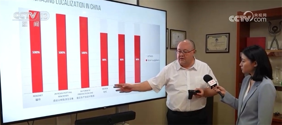 艾菲汽車零部件亞太區(qū)首席執(zhí)行官 埃里克·勒邁爾:從這張圖表中可以看出,就電機而言,我們使用的電機有80%來自當?shù)毓?,磁鐵則100%來自當?shù)毓?,當?shù)毓藤|(zhì)量好、價格低。