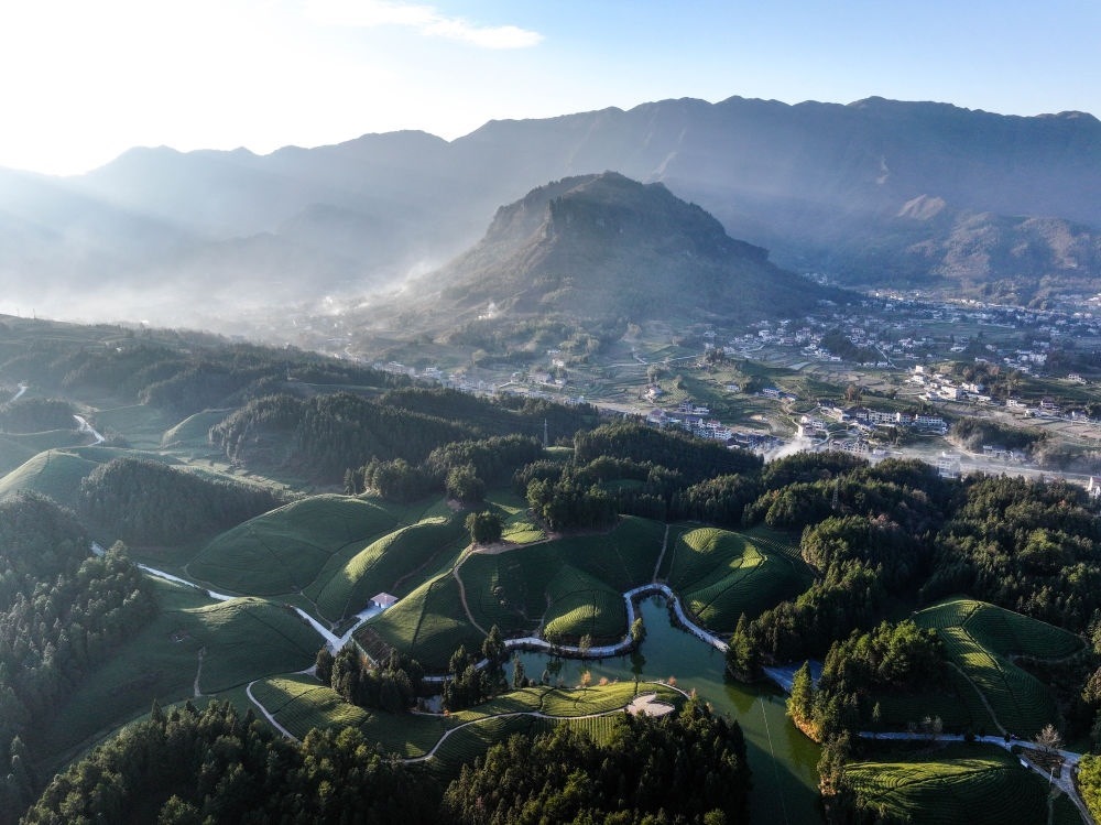 這是2023年12月5日拍攝的湖北省鶴峰縣走馬鎮(zhèn)楊柳池茶園風(fēng)光(無人機照片)。新華社記者 楊文斌 攝